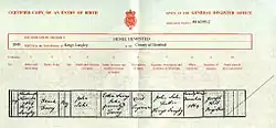 Frank Toovey Lake was born into a professional family in 1849. His father was a civil engineer involved with the construction of the Grand Junction Canal and his mother's family were mill-owners in Kings Langley, Hertfordshire, England.[2] He was the middle son of three siblings all of whom were raised in Kings Langley. When the three children were still young, their mother died of cholera at the age of 29 in 1854; their father died ten years later of tuberculosis and both were buried in the graveyard of All Saints, Kings Langley[3]