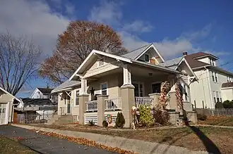 The Frank Wilbur House is a historic house in Woonsocket, Rhode Island, USA near Park Square, Rhode Island. Built c. 1923, this is an architecturally distinctive bungalow form with Japanese elements. It has a complex roof line with three gables and an L-shaped entrance porch with posts mounted on high yellow-brick piers. The front windows are organized in threes with small colored-glass panes flanking clear glass.[2] Wilbur was a farmer who built this house between his farm and Woonsocket Agricultural Society fairgrounds, which is now Our Lady Queen of Martyrs Church.[3]