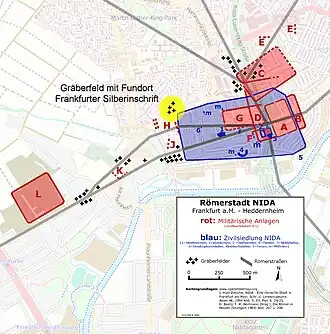 - ^ Huld-Zetsche, Ingeborg (1994). "Nida: eine römische Stadt in Frankfurt am Main". Schriften des Limesmuseums Aalen. 48: 24–25.
