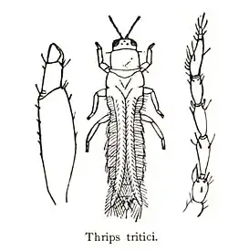 Frankliniella tritici, the eastern flower thrips, is a species of thrips (Order Thysanoptera) in the genus Frankliniella.[2] F. tritici inhabits blossom, such as dandelion flowers.[3] They can directly damage plants, grasses and trees, in addition to commercial crops,[3] and as a vector for tospoviruses, a form of plant virus, it particularly affects small fruit production in the United States, including strawberries, grapes, blueberries and blackberries.[2] It can also affect alfalfa, oats, beans and asparagus crops.[4] The species features strap-like wings edged with long hairs, a design which increases aerodynamic efficiency in very small arthropods; the reduced drag means the insect uses less energy.[3] They extract nutrients directly from individual plant cells, and may also digest cells of fungi in the leaf litter.[3]