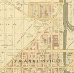 Franklinville was called "Franklin" on maps in 1860 and 1868, with Nicetown to the northeast, Feltonville to the north, Rising Sun to the southwest, Coopersville to the east-southeast.[10] One of the first appearances of "Franklinville" in cartography was in 1862, which was located in the 25th ward of the city.[11] In 1888, it was narrowly delineated as the "vicinity of Erie Avenue to Westmoreland Street, between Broad Street and Sedgley Avenue."[12]