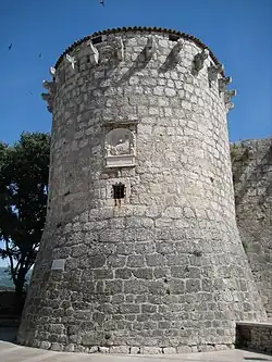 Frankopan Castle on Kamplin was raised by Croatian noble family of Frankopan through several centuries and several generations. After the death of the first Count (knez) of Krk Dujam I Krčki, his sons continue to dominate over the island and the town of Krk. They left first architectural traces in the town of Krk. The oldest part of fortification is the square tower with the diocese, in which Frankopans courtroom was located. The inscription on the lunette over the entrance confirms that the building was raised in 1191, during the time of Bishop John and counts Vid I and Bartol I (Dujam's sons), with the help of the entire municipality.[2]