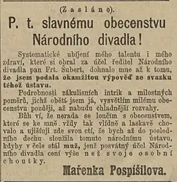 One of the big controversies was Šubert's hatred of actress Maria Pospischil (Pospíšilová in Czech spelling), one of the greatest Czech dramatic talents of the end of the 19th century. In the winter of 1884, after fierce disputes with Pospischil refused to submit to the director any longer and published her critical opinion on conditions at the theatre: "The systematic killing of my talent and my health by the director of the National Theatre, Mr. František Šubert, pushed me to resign immediately. I will explain the details of the behind-the-scenes intrigues and love affairs of which I am the victim to my beloved audience later, when I am of a cooler mind. God knows I hate to say goodbye to an audience that has always treated me so kindly and dearly, and I assure here on my honor that I would serve this national institution until my last breath if it were led by a man who values the sacred purpose of the National Theatre more highly than his appetites" This quote was both published in newspapers and handed out in the National Theatre on the day of Marie Bittnerová's performance. Pospischil was the first and only one to speak publicly about Šubert's sexual relationships with actresses. Both, she and Pulda, were dismissed. They tried to reconcile with Šubert, but in vain. Šubert did not accept their apology and he never forgave Pospischil for this insult. [25] A number of Czech politicians tried to soften the director's harshness and lobbied for Pospischil, but in vain as well.[26] Pospischil, although later she was repeatedly asked about the reasons for her actions and choice of words, never commented on this topic.