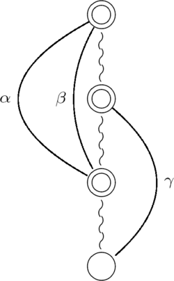 In the following figures, simple circle nodes represent vertices, double circle nodes represent subtrees, twisted segments represent tree paths, and curved arcs represent cotree edges. The root of each tree is shown at the bottom of the figure. In the first figure, the edges labeled and are T-alike, meaning that, at the endpoints nearest the root of the tree, they will both be on the same side of the tree in every planar drawing. In the next two figures, the edges with the same labels are T-opposite, meaning that they will be on different sides of the tree in every planar drawing.