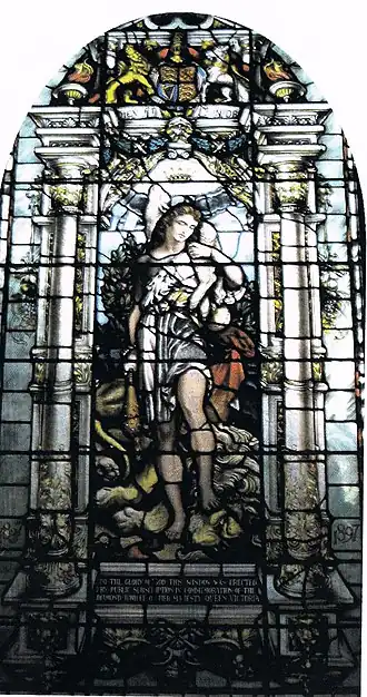 The east windows behind the altar and the north and south aisles all have this theme, and were the work of Heaton, Butler and Bayne. The north aisle window was installed in commemoration of the Diamond Jubilee of Queen Victoria. After a bomb attack by the IRA on Manchester in 1996 the window was restored in memory of Maria Isabella Blythe (1898–1985).