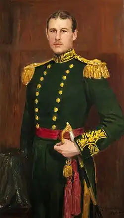 The Rough Riders were established on 27 July 1901 as 1st County of London Imperial Yeomanry (Rough Riders) under the command of Viscount Maitland, promoted to lieutenant-colonel, He saw further active service in the European War of 1914–1918, in which he was wounded. He was appointed OBE in 1919 and succeeded his father in 1924, taking up residence at Thirlestane Castle near Lauder in Scotland.[3]