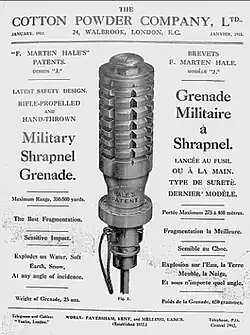 With little War Office interest in the field in the pre-war years Hale came to dominate grenade development. He was granted 11 patents for hand grenades and rifle grenades between 1906 and the start of the First World War.[3]: 38 He developed the Hales rifle grenade in 1908 and marketed it widely, demonstrating the weapon to representatives from 18 countries including France, Germany, Russia, Mexico and Spain.[3]: 38 [1] It was dismissed by the chief draftsman at the Woolwich Arsenal as "a crazy and audacious monstrosity" that was likely to burst rifle barrels.[4] Hale sold a number of grenades to Germany in 1911 but they were not selected for service.[3]: 38 He exported the rifle grenade to government of Mexico where they were used during the Mexican Revolution, and to Brazil leading to an association of the weapon with suppression of disorder and with colonial warfare.[3]: 38 [5] By 1911 Hale had modified the grenade to incorporate a wind vane.[3]: 108 The grenade would not detonate unless the wind vane was activated by flight, avoiding the danger of a grenade detonating in front of the user after falling off the rifle.[6]