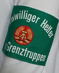 In 1961 the Border Police were renamed as Border Troops, therefore the denomination was changed to Freiwilliger Helfer der Grenztruppen (Voluntary Auxiliary of the Border Troops).[1] Officially the FHG should assist the Border Troops to maintain public safety and the socialist system. Unofficially the main target was to close off the German border to West Germany and to prevent East Germans from fleeing to West Germany. The FHG volunteers fulfilled their patrol missions in plain clothes, but were identifiable by their armband. This auxiliary service was defunct a few days before the German reunification in 1990.