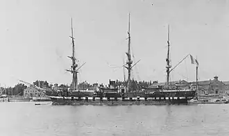 On 18 November 1889, Dubourdieu was recommissioned to deploy to the Pacific station, replacing the cruiser Duquesne as the flagship there. The ship's arrival was delayed when engine damage forced her to return to Cherbourg for repairs on 15 February 1890. She departed again on 10 April.[5] The ship sailed south through the Atlantic, rounded Cape Horn, and made calls in a series of ports along the way, including in Chile, Peru, and the Hawaiian Kingdom, before reaching Tahiti in French Polynesia.[1] After arriving in the Pacific, she operated with the unprotected cruisers Volta and Champlain.[8] From 30 June to 23 July 1891, the ship was dry docked at the Mare Island Naval Shipyard for repairs to her stern.[4] During the early 1890s, the ships were primarily responsible for patrolling the French colonies in the Pacific. She remained in the area into 1893; by that time, the unit also consisted of the unprotected cruisers Duguay-Trouin and Duchaffault.[9] Later that year, Dubourdieu was recalled to France, where she was placed in reserve through 1895.[5]