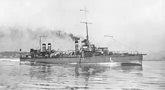 Lansquenet was ordered from Dyle et Bacalan and was launched at their shipyard in Bordeaux on 20 November 1909. She was completed in October 1910.[4] When the First World War began in August 1914, Lansquenet was assigned to the 2nd Destroyer Flotilla (2e escadrille de torpilleurs) of the 1st Naval Army (1ère Armée Navale). During the preliminary stages of the Battle of Antivari, Montenegro, on 16 August, the 1st, 4th and 5th Destroyer Flotillas were tasked to escort the core of the 1st Naval Army while the 2nd, 3rd and 6th Flotillas escorted the armored cruisers of the 2nd Light Squadron (2e escadre légère) and two British cruisers. After reuniting both groups and spotting the Austro-Hungarian protected cruiser SMS Zenta and the destroyer SMS Ulan, the French destroyers played no role in sinking the cruiser, although the 4th Flotilla was sent on an unsuccessful pursuit of Ulan. Having broken the Austro-Hungarian blockade of Antivari (now known as Bar), Vice-Admiral (Vice-amiral) Augustin Boué de Lapeyrère, commander of the 1st Naval Army, decided to ferry troops and supplies to the port, escorted by the 2nd Light Squadron and the 1st and 6th Destroyer Flotillas while the rest of the 1st Naval Army bombarded the Austro-Hungarian naval base at Cattaro, Montenegro, on 1 September. Four days later, the fleet covered the evacuation of Danilo, Crown Prince of Montenegro to the Greek island of Corfu. The 2nd Flotilla bombarded Stončica Lighthouse on the island of Lissa on 19 September. The flotilla escorted multiple small convoys loaded with supplies and equipment to Antivari, beginning in October and lasting for the rest of the year, always covered by the larger ships of the Naval Army in futile attempts to lure the Austro-Hungarian fleet into battle. The Naval Army raided Lissa and the island of Lastovo on 2 November with Lansquenet entering Vis harbor and extorting a ransom from the townsmen lest the French bombard the town. As they departed, the French shelled the lighthouse again.[5]