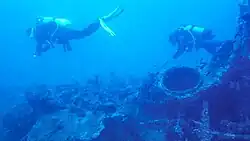 Divers on the wreck of Ariane with the engine compartment hatch open
