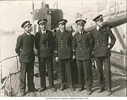 The five officers of Pégase on her main deck in 1934. Second from left is Pierre Gabriel Daussy, a future contre-amiral (counter admiral).