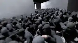 A still from the music video for "Fried", showing a group of people running across a series of hallways.
