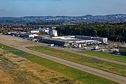 The Messe Friedrichshafen convention center is just north of the airport's runway. The center hosts an annual European general aviation conference AERO Friedrichshafen and other conferences.[4]