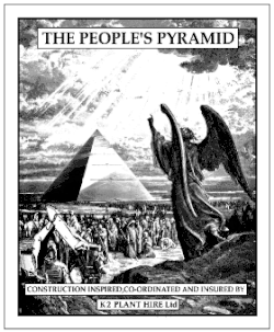 Around the time of the single's release, further full-page adverts appeared in the national press, this time asking readers "***k The Millennium: Yes/No?", with a telephone number—the "Millennium Crisis Line"—provided for voting: "If you want to fuck the millennium, press '1'. If not, press '2'."[33] The adverts were placed by K2 Plant Hire Ltd., who duly claimed that 18,436 (89%) of respondents wished to fuck the millennium. Thus, on 31 October 1997, K2 Plant Hire announced plans to build the "Great Northern Pyramid Of The People", or "The People's Pyramid",[40] from as many house bricks as there were British 20th century births.[41] The company estimated that the structure would require approximately 87 millions bricks; be 150-foot (46 m)-high; and take five years to complete, all at no cost to the taxpayer.[40][41] Members of the public were urged to donate bricks, with 1.5 bricks per Briton being needed to complete the project.[40][41] K2 Plant Hire promised that the Pyramid "will be open to the public free of charge, 24 hours a day, 365 days a year. You will be able to do what you want with it. Climb it, paint it, polish it, eat your sandwiches on it or chip it away. It will stand for as long there is any of it left. It will promote nothing. Be sponsored by nobody. And owned by everybody.";[40] Melody Maker noted the pointed contrast of the "intended virtues" of the People's Pyramid with "the drawbacks of the officially sponsored Millennium Dome".[40] The Guardian noted drily that the idea "would appear to be far-fetched even by [Cauty and Drummond's] own standards" and that "planning permission might pose a problem."[42][n 3]