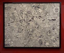 Fuller's map of London, titled London Town, was drawn over a period of 10 years from 2005 to 2015.[4][6] It was drawn with black ink on archival board. While drawing, he explored the city by cycling and walking, documented his research with photographs, made extensive notes and studied existing maps.[8] London Town was unveiled in St Pancras railway station clock tower in London in 2015 and has been exhibited at the Royal College of Art, London.[4] London Town has been acquired by the British Library for the national map collection.[9]
