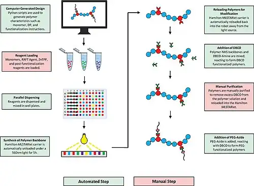 - ^ a b Rojas, Ramiro; Harris, Nicole K.; Piotrowska, Karolina; Kohn, Joachim (January 2009). "Evaluation of automated synthesis for chain and step-growth polymerizations: Can robots replace the chemists?". Journal of Polymer Science Part A: Polymer Chemistry. 47 (1): 49–58. Bibcode:2009JPoSA..47...49R. doi:10.1002/pola.23119.