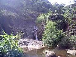 Despite its relatively small area, Fundão extends from the coast to the Serra do Castelo, a prominent geographical feature in central Espírito Santo.[91] Its terrain is highly undulating, with 61.53% of its area having a slope of less than 30%.[93] The eastern region consists of lowlands and a nearly straight coastline, except for the Flecheira point, while the western region features elevations shaped by crystalline rocks.[4] Located 13 kilometres (8.1 mi) from the seat, on the border with Santa Teresa, is the Pico do Goiapaba-Açu, a granite formation[4] rising 850 metres (2,790 ft),[94] offering views of the region between Greater Vitória and Linhares.[91]