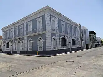 The corner lot was first owned by Juan de Dios Conde, a two-time mayor of Ponce in 1836 and 1839. Some 30 years later, in 1872, a new two-story structure was built which became, three years later, Hospital Militar Español de Ponce. In 1896, Gaspar Bonnín y Miró, a businessman from Mallorca, Spain, bought the property, as the Hospital moved to a new and more spacious building elsewhere in the city. In 1898 the structure was taken over by the US Army, upon its invasion of Puerto Rico in July of that year. Eventually the property was acquired by the government of Puerto Rico, and a new building was erected at this corner lot to serve as the site of the Puerto Rico Criminal Courthouse for the District of Ponce.[2] The structure for the Ponce District Courthouse, and still standing, was designed by Manuel Víctor Domenech, an architect from Isabela, Puerto Rico, in the neoclassical style.[3] The building has been home to universities (Interamerican University of Puerto Rico at Ponce was located here for many years[4]) as well as serving as a residential and commercial rental site.[5] This building was built in 1897 in the Neoclassical style, and served as the Ponce Criminal Court, District Court for the Puerto Rico Court System, Centro Español de Ponce headquarters, and as the Ponce campus of the Universidad Interamericana de Puerto Rico as well as for Caribbean University.[6][a]