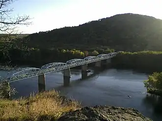 Furnace Mountain as seen from Point of Rocks, Maryland, with Point of Rocks Bridge in foreground