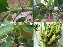 Management of the MMD includes sanitation by removing infected flowers and branches once the disease is established in the orchard. Although it can be time consuming and difficult when the affected trees are large, but it’s an important component for management of disease.[11] Furthermore, using clean nursery stock, no grafting with infected budwood, and decontamination of infected fruit prior to storage or shipping can help to lower disease and spread.[10] Under experimental conditions, sprays with concoctions containing extracts from Datura stramonium, Calotropis gigantea and Azadirachta indica (neem), showed antifungal activity and controlled the malformation symptoms on mango.[8] Chemical control with fungicides is possible but there is no consensus over what chemical is most effective.[11]