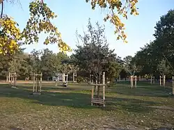 Since 2011, in the middle of the park, an orchard with apple, pear and greengage trees was created. In total, there were 26 trees after the third planting in early April 2013.[13] As a memorial to deceased Kreuzberg actor Eralp Uzun, family and friends planted another tree in the meadow in May 2013.