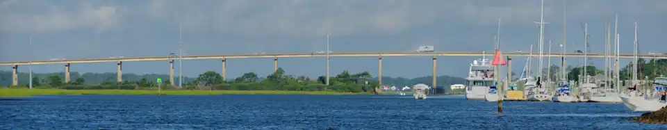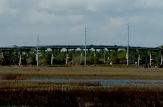 When the ICW was completed in the late 1930s, a swingbridge initially provided access to Oak Island. Destroyed by a barge strike in 1971, construction of a high rise replacement named after G. V. Barbee, a distinguished Oak Island resident, began in 1972 and opened for traffic in 1975 (interim service included a ferry and pontoon bridge).[1] The extensive repairs which commenced in October 2018 were completed in April 2019.[2]