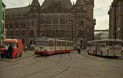 GT4 train from Bremer Wagonbau in original colours in front of the city hall of Bremen