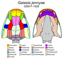 Gaiasia is an extinct genus of stem-tetrapods from the Early Permian of Namibia, containing a single species, Gaiasia jennyae. Gaiasia was a freshwater predator which was exceptional among stem-tetrapods for its combination of relatively enormous size, Southern occurrence, and late survival.[1]