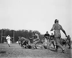 The football team was organized in 1883 by coach John B. Hotchkiss. In the 1890s, the football huddle originated at Gallaudet when the team noticed that their opponents were trying to see and read their signs in order to try to guess their plays.[6][7][8][9]
