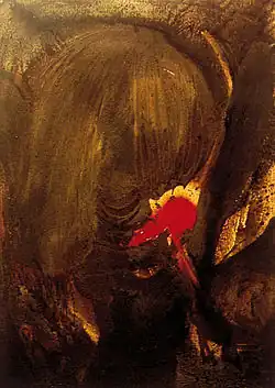 In 1986 the Museo Español de Arte Contemporaneo hosted an exhibition of his works from 1970 to 1986. In 1991 he exhibited at the Spazio Ansaldo, Milan, in an installation designed by Renzo Piano,[7] and more spectacular was an exhibition at the Taipei Fine Arts Museum, Taipei, Taiwan, which was widely commented upon by the critic Roberto Tassi.[10] In 1995, an incredible exhibition was shown at the Casa Das Artes in Vigo Spain, crucial from a critical point of view, as the critic Marco Ricardo Barnatán wrote in the exhibition catalogue, for its statement of Orellana's renewed aesthetic and realisation ideals and practice, a trait that indeed has marked the work of the artist ever since. Christian Stein, at the gates of the Spanish Pavilion at the 1995 Venice Biennale, declared that "Orellana is the most interesting artist that Spain has created since Tàpies and Miró".[9] In 1998, his gallery, Christian Stein, showed his works in a solo pavilion at the ARCO art fair in Madrid.[11] In a tribute to the power and human drama of Orellana's late 1960s works, a nightmarish 1967 piece was included in the major 2005 exhibition held in Turin titled "Il Male" that comprised works of leading artists from the quattrocento to the present.[12] The curator, Teresa Sacchi Lodispoto, commented "In a nightmarish atmosphere reinforced by a palette of chromatic contrasts of Goya-like memory and in equilibrium between bright chromatism and restrained sobriety, it is impossible to understand what, in effect, is revealed before the eyes of the viewer".[12]