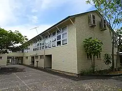 An important component of Queensland state schools was their grounds. The early and continuing commitment to play-based education, particularly in primary school, resulted in the provision of outdoor play space and sporting facilities, such as playing fields and tennis courts. Also, trees and gardens were planted to shade and beautify schools.[45] Mature trees, including two Fig trees (Ficus spp.) and four Mango trees (Mangifera indica), were retained on the largely bare Geebung State School site. By July 1955, a large playing field was formed to the west of the school buildings.[46][47][48] Tennis courts and a swimming pool with change rooms and seating (east of the tennis courts) were on site by 1968. By April 1976, the school grounds also included an adventure playground (northwest corner), and basketball courts (south of the playing field).[49][1]