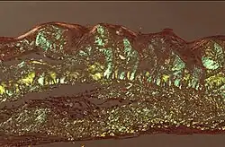 Apple green dichroism of subepithelial deposition of amyloid viewed under polarized light. Congo red stain.