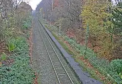 The line climbs after Marl-Drewer. The junction of Marl CWH siding is located at kilometre 11.3. Until 2003, the operating point was classified as a railway junction.[6] The junction connects the railway of RBH Logistics (now a subsidiary of DB Cargo) to Chemiepark Marl (formerly Chemische Werke Hüls, abbreviated CHW). There is an alternative connection to the chemical park from Marl-Sinsen station on the Wanne-Eickel–Hamburg railway. This connection crosses the line over a bridge directly after the Marl CWH siding.