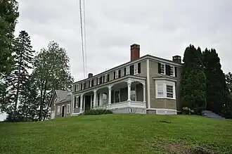 The General Alexander Campbell House is located on the north side of United States Route 1, near the eastern end of the village of Cherryfield, atop the village's highest point.[2] It is an L-shaped two story wood-frame structure, with a hip roof, twin interior chimneys, and clapboard siding. Its main entrance is centered in the southern (street-facing) facade, framed by pilasters and a gabled pediment. It is flanked on either side by Italianate polygonal window bays; the upper story of the facade has five sash windows. The western facade, the long portion of the L, has a porch extending along much of its length, with square posts, carved brackets, and a jigsawn balustrade.[3]
