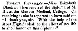Elizabeth Blackwell – Female Physician – March 9, 1849