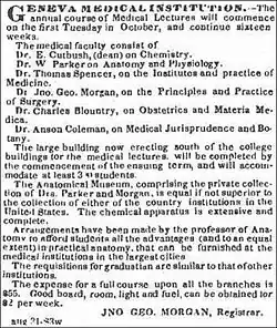15. ^ a b c d e f g "Medical Institution of Geneva College, Geneva, N.Y., Sept. 1834". Cayuga Gospel Messenger. Cayuga, New York. October 18, 1834.
