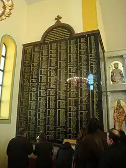 Between 29 June and 7 July 1941, 280 Serbs were killed and thrown into pits near Kostajnica.[125] Large scale massacres took place in Staro Selo Topusko, including in the village of Pecka with 250 victims,[126] and Perna where 427 old men and children were killed.[127] A large number were also killed in Vojišnica[128] and Vrginmost.[129] About 60% of Sadilovac residents lost their lives during the war.[130] More than 400 Serbs were killed in their homes, including 185 children.[130] On 17 April 1942, 99 Serbs were burned alive in the village of Kolarić, near Vojnić.[131] A total of 3,849 inhabitants of the town of Vojnić were massacred during the war, out of a total of approximately 5000 inhabitants.[127] That same month, a total of 759 women, children and elderly Serbs were massacred near the village of Krstinja.[127] On 31 July 1942, in the Sadilovac church the Ustaše under Milan Mesić's command massacred more than 580 inhabitants of the surrounding villages, including about 270 children.[132] At various dates, 2,019 primarily women and children were killed in the village of Rakovica.[127]