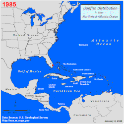 The lionfish, originally from the Indo-Pacific, were introduced to the Atlantic Ocean in the mid-1980s. Their population has since grown significantly because they lack natural predators in their new environment.[16] This unchecked growth has led to a decline in fish and crustacean populations, and even the health of coral reefs is suffering as herbivorous fish vanish.[17] NOAA researchers confirm that invasive lionfish populations will keep increasing and can't be eradicated using conventional methods.[18]