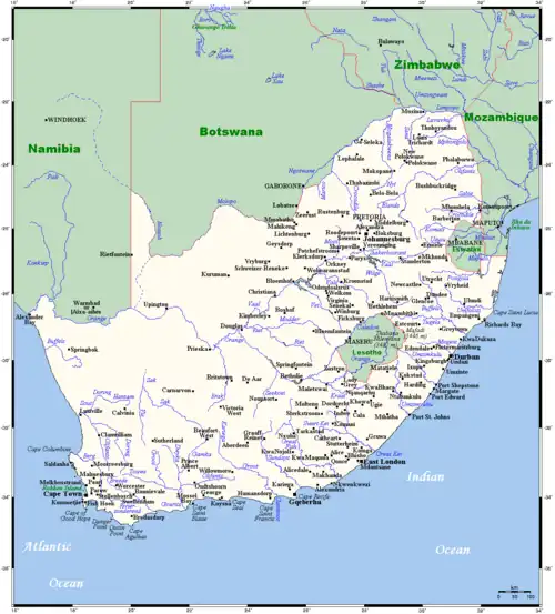 Several small rivers run into the sea along the coastline, but none is navigable and none provides useful natural harbours. The coastline itself, being fairly smooth, provides only one good natural harbour at Saldanha Bay north of Cape Town. A lack of fresh water, however, prevented permanent settlement here until relatively recently. The Bay of Natal looks, on the map, like a good natural harbour, but, in its natural state, it was dry at low tide.[15] Nevertheless, busy harbours now exist at Cape Town, Port Elizabeth, East London, Durban in the Bay of Natal, and Richards Bay. Saldanha Bay is today an important harbour at the end of the Sishen–Saldanha railway line for the export of Iron ore from the interior.
