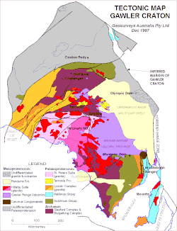 The Gawler Craton is a large geological province in South Australia, with a size comparable to the United Kingdom. Smaller geological features in the province include the Stuart Range Basin and the Pimba Platform. This Gawler Craton is bounded by the Great Australian Bight to the south and Karari Shear Zone to the north. The separation of land due to such features often separates the types of sedimentary rock found in the Gawler Craton.[20]