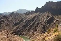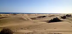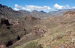 Erosion has cut ravines and canyons (known locally as barrancos) into the lava piles of some of the islands, as in this example at Barranco de Tirajana, Gran Canaria.[19]