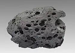 Basaltic lava rock with holes (vesicles) where bubbles of gas were trapped within the lava when it was molten,[31] from Lanzarote (length: 6 cm (2.4 in))