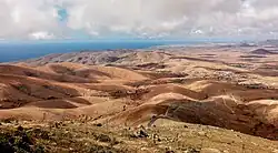 Lanzarote and Fuerteventura are separated by an 11 km-wide (7 mi), 40 m-deep (130 ft) ocean strait. Both islands are parts of a volcanic ridge called the Canary Ridge. These two islands have sometimes been a single island in the past when worldwide sea level was lower than its present level, for example during the Last Glacial Maximum about 20,000 years ago.[9][10] The single island is sometimes referred to as Mahan.[11]