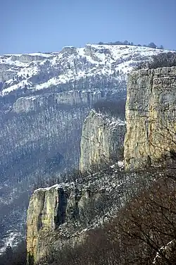 The plateaus form a generally horizontal structure, with low-amplitude, long-wavelength décollement folds. Their weak deformation results from the thin sedimentary cover due to a long erosion phase between the Late Cretaceous and the Miocene.[26] They thus form local undulations that do not exceed 100 m[a 3] and exhibit very little shortening, less than 5 kilometers.[26] In some areas, the plateaus are incised by reculées, valleys carved by rivers.[a 4] The Jura plateaus have low-relief landscapes with a monotonous appearance. The nearly tabular disposition of the sedimentary layers favors the preferential erosion of younger layers, so that the Cretaceous is absent, leaving Jurassic layers exposed. Two plateau units are distinguished: the Lons-le-Saunier and Saône-Bouclans plateaus, with an average altitude of 500 to 550 m, while the Champagnole, Levier-Nozeroy, Ornans, and Amancey plateaus reach an average altitude of 650 to 750 m.