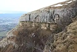 The Internal Jura, also known as the "Haute-Chaîne," "Folded Jura," or "Helvetic Thrust Belt," forms the backbone of the massif and represents the current northern boundary of the Swiss Molasse Basin. The development of high-amplitude, northwest-oriented fault-propagation folds[4][5] allows for significant imbrication of the sedimentary cover. These folds, associated with northwest- or southeast-verging thrust faults (back-thrusts), have displacements exceeding one kilometer. As a result, sedimentary cover duplication leads to significant thickening of the chain, accommodating a large portion of the shortening (up to 20 km).[26] The fold amplitude depends on the thickness of the deformed sedimentary cover (ranging from 800 to 2,000 m) and the shortening rate.[24] It reaches its maximum in the Central Jura and decreases laterally, either by the plunging of fold axial traces or by their truncation due to strike-slip fault planes. The attenuated structures of the Haute-Chaîne extend to the northern tip of the Vercors Massif (Dent de Moirans) via the western reliefs of the Chartreuse Massif (Épine Range and Grand-Ratz Plateau) and south of the Swabian Jura.