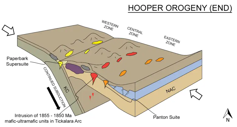Enhanced partial melting, as a result of further subduction during the later stages of the Hooper Orogeny, produced widespread mafic and ultramafic intrusions in the Central Zone, with intrusions of the Paperbark Supersuite in the Western Zone, and the intrusions of the Panton Suite in the Eastern Zone.[10]