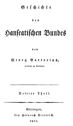 His major work was his monograph Geschichte des Hanseatischen Bundes. (engl.: History of the Hanseatic League.) published in three volumes 1802–1808. His research on this topic was the first modern work on the Hanseatic League. A second edition prepared by him was published post mortem in 1830. He made a historical study of the rule of the Ostrogoths in Italy while professor at Göttingen (Versuch über die Regierung der Ostgothen wabrend ihrer Herrschaft in Italien; Hamburg, 1811), an extremely painstaking treatise on Ostrogothic administration, chiefly compiled from the letters of Cassiodorus.[1] He is also known as translator and popularizer of Adam Smith's Wealth of Nations. As an economist he gave lectures on taxation.