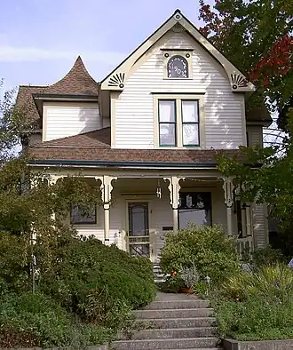 George Strout, one of Sebastopol's early mayors, bought a lot at 253 Florence Avenue from Gertrude Huntley in 1901 and built a Queen Anne Victorian for his family in 1903. Strout, a master carpenter, founded Sebastopol's first planing mill, the Strout Planing Mill, which supplied all of the materials and millwork for his home. Strout was known for his staircases; he also produced ladders, bee hives and fruit dryer trays. He built several houses in Sebastopol during his career, but the Strout House is the only one on the National Register of Historic Places. The Strout House is notable for the excellence of its formal Queen Anne design, the craftsmanship of Sebastopol's carpenter/builders, and the quality of the Strout millwork.[3]