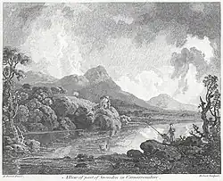 Prints of Barret's work were published by William Watts in his Views of the Seats of the English Nobility and Gentry in 1779–1789 and in Samuel Middiman's Select Views in Great Britain published in 1783–1789. Watts engraved six views by Barrett of Claremont House in Surrey, Burton Constable Hall, the Lodge at Richmond Park, Kedleston House in Derbyshire and Cadland Park in Hampshire. Middimans views were of Winnadermere [sic], Ulleswater [sic] and Shanklin Chine.[19] The National Library of Wales also has a number of prints of paintings by Barret, engraved by Roberts, of scenery in Snowdonia.